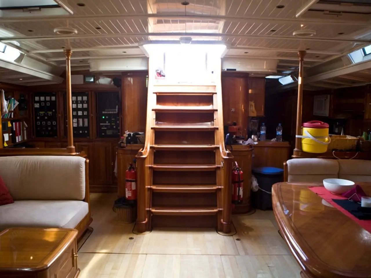 The bathroom is a sanctuary of warmth, featuring light wood and touches of brass. The dining area is no less impressive, with a table from Another Country surrounded by Sibast no8 chairs and a Trapeze chandelier casting a soft glow.